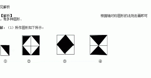 用如图(1)所示的瓷砖拼成一个正方形,使拼成的图案成轴对称图形,请你在图(2)、图(3)、图(4)中各画出一种拼法.(要求三种拼法各不相同,所画图案中的阴影部分用斜线表示)