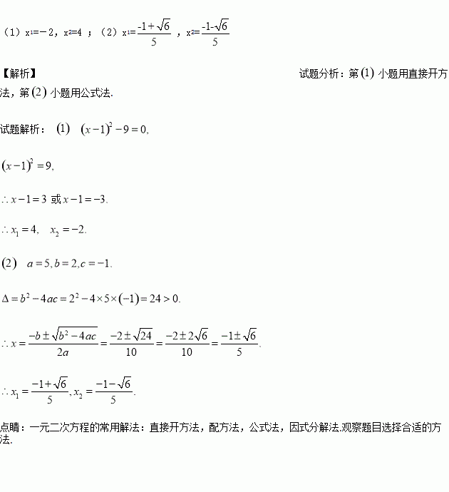 (1)(x-1)2-9=0 (2)5x2+2x-1=0.