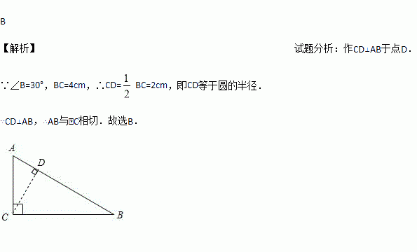 在Rt△ABC中,∠C=90°,∠B=30°,BC=4 cm,以点C为圆心,以2 cm的长为半径作圆,则⊙C与AB的位置关系是( )