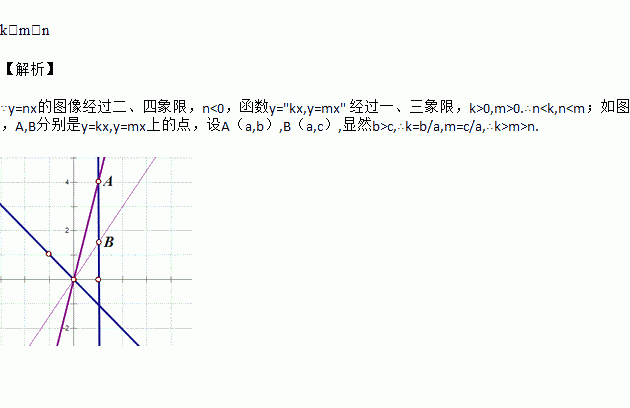 如图,正比例函数y=kx,y=mx,y=nx在同一平面直角坐标系中的图象如图所示.则比例系数k,m,n的大小关系是________.