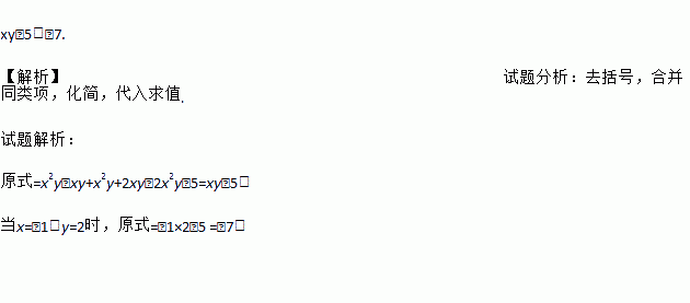 xy﹣5,﹣7. 【解析】试题分析:去括号,合并同类项,化简,代入求值. 试题解析: 原式=x2y﹣xy+x2y+2xy﹣2x2y﹣5=xy﹣5, 当x=﹣1,y=2时,原式=﹣1×2﹣5 =﹣7.