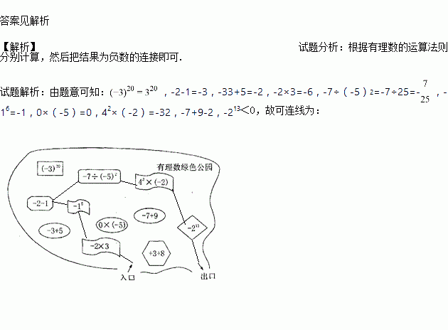 在有理数绿色公园中,有许多景点,小明此次打算游玩结果为负的所有景点,你能帮小明设计一条游玩的路线吗?请你在图中把你认为正确的路线标出来.