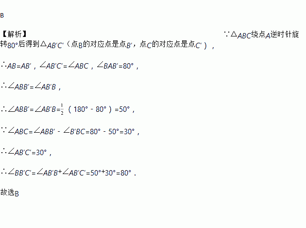 如图,将△ABC绕点A逆时针旋转80°后得到△A′B′C′(点B的对应点是点B′,点C的对应点是点C′,连接BB′,若∠B′BC=20°,则∠BB′C′的大小是( )