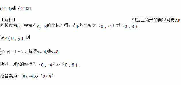 已知点A(1,0)、B(0,2),点P在y轴上,且△PAB的面积是3,则点P的坐标是_______.