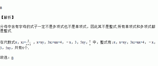 在代数式π,x2+,x+xy,3x2+nx+4,﹣x,3,5xy,中,整式共有( )