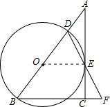 分析:(1)连接OE,由AC为圆O的切线,利用切线的性质得到OE垂直于AC,再由BC垂直于AC,得到OE与BC平行,根据O为DB的中点,得到E为DF的中点,即OE为三角形DBF的中位线,利用中位线定理得到OE为BF的一半,再由OE为DB的一半,等量代换即可得证;