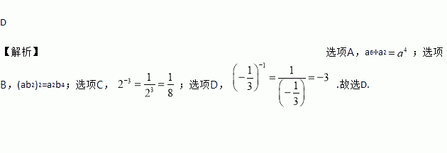 A. a6÷a2=a3 B. (ab2)2=ab4 C. 2-3=-6 D. =-3