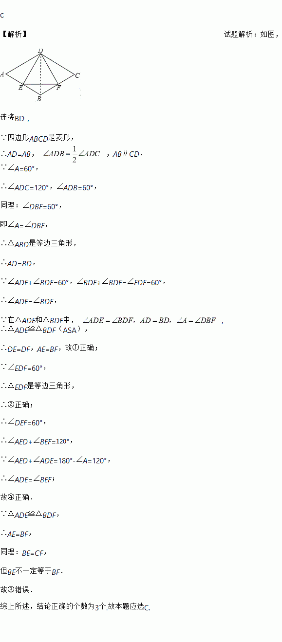 如图,在菱形ABCD中,E是AB边上一点,且∠A=∠EDF=60°,有下列结论:①AE=BF;②△DEF是等边三角形;③△BEF是等腰三角形;④∠ADE=∠BEF,其中结论正确的个数是( )