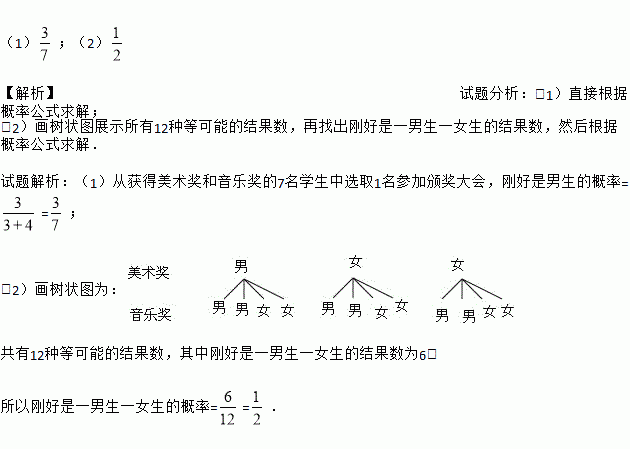 (1);(2) 【解析】试题分析:(1)直接根据概率公式求解; (2)画树状图展示所有12种等可能的结果数,再找出刚好是一男生一女生的结果数,然后根据概率公式求解. 试题解析:(1)从获得美术奖和音乐奖的7名学生中选取1名参加颁奖大会,刚好是男生的概率==; (2)画树状图为: 共有12种等可能的结果数,其中刚好是一男生一女生的结果数为6, 所以刚好是一男生一女生的...