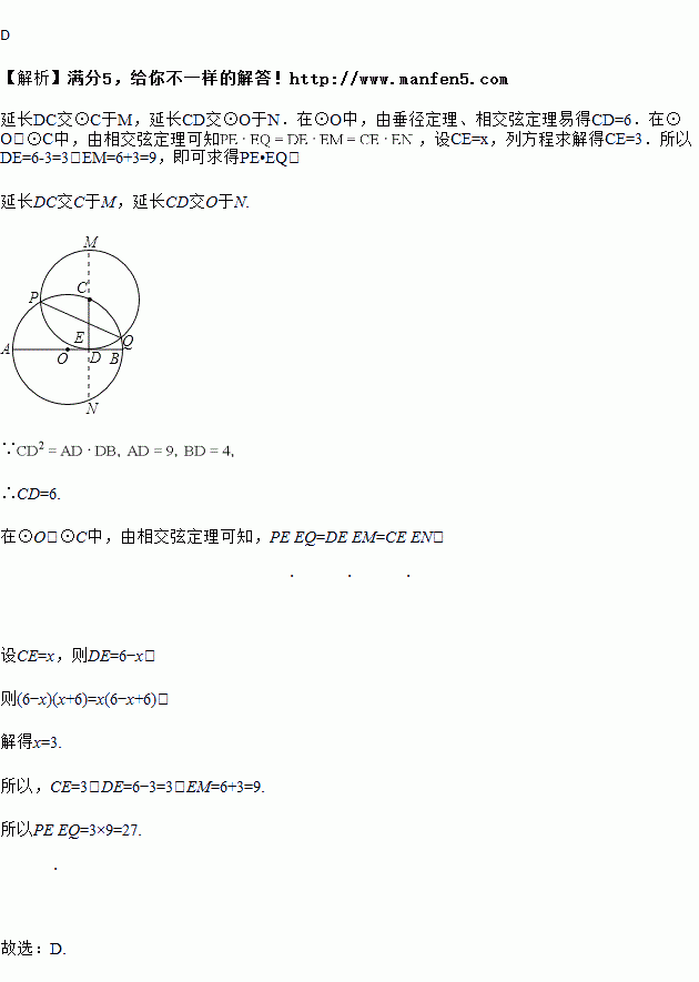 如图,已知AB为⊙O的直径,C为⊙O上一点,CD⊥AB于D,AD=9,BD=4,以C为圆心,CD为半径的圆与⊙O相交于P,Q两点,弦PQ交CD于E,则PE•EQ的值是( )