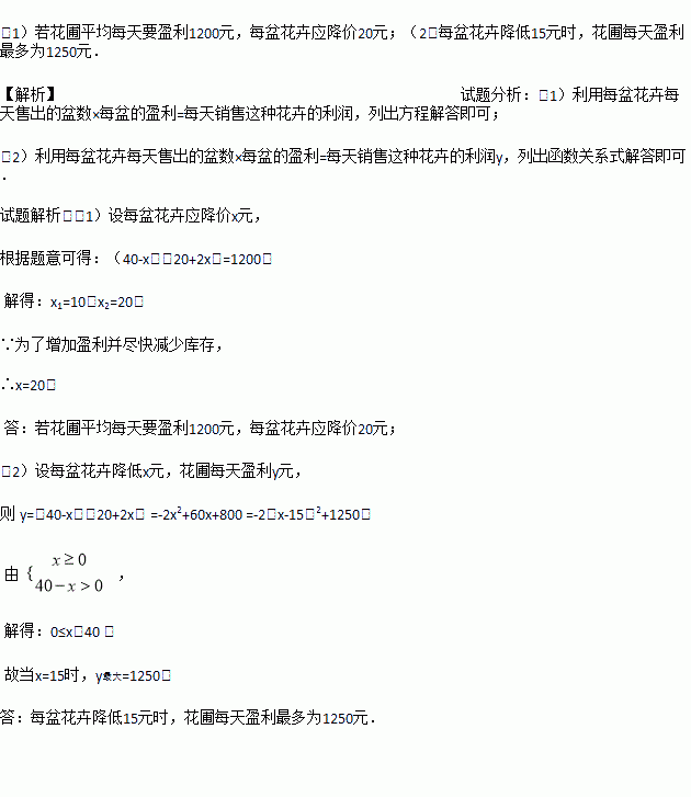 (1)若花圃平均每天要盈利1200元,每盆花卉应降价多少元?