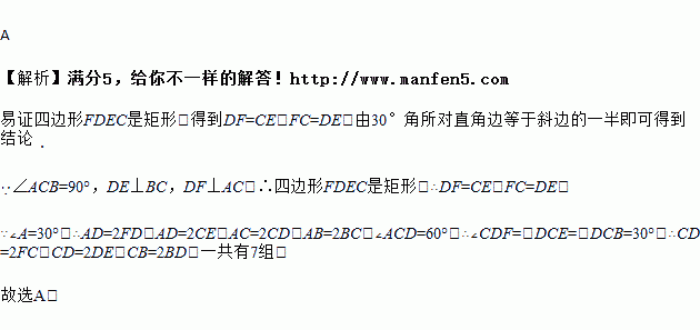 如图,在Rt△ABC中,∠ACB=90°,∠A=30°,CD⊥AB,DE⊥BC,DF⊥AC,垂足分别为D,E,F,则图中的线段存在2倍关系的有( )
