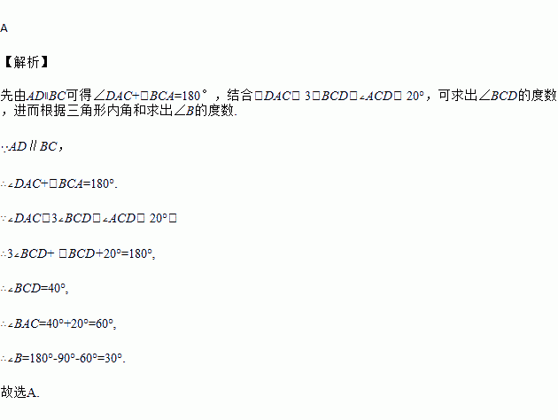 如图,AD∥BC,∠DAC=3∠BCD,∠ACD=20°,∠BAC=90°,则∠B的度数为( )