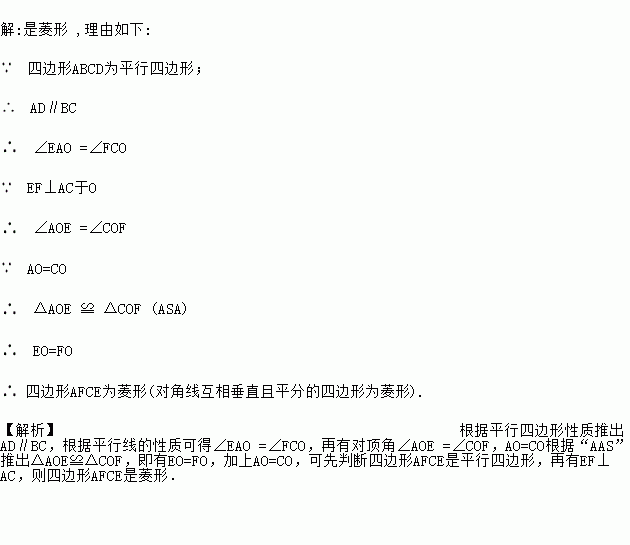 如图,在ABCD中,O是对角线AC的中点,过点O作AC的垂线与边AD、BC分别交于E、F.四边形AFCE是菱形吗?请说明理由.