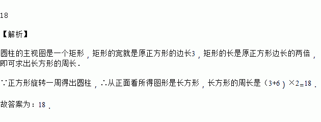 如图,正方形ABDC的边长为3,以直线AB为轴,将正方形旋转一周,形成一个几何体,则从正面看到的形状图的周长是_______.