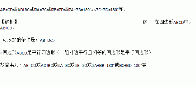 如图,在四边形ABCD中,AB∥CD,请你添加一个条件,使得四边形ABCD成为平行四边形,你添加的条件是 .