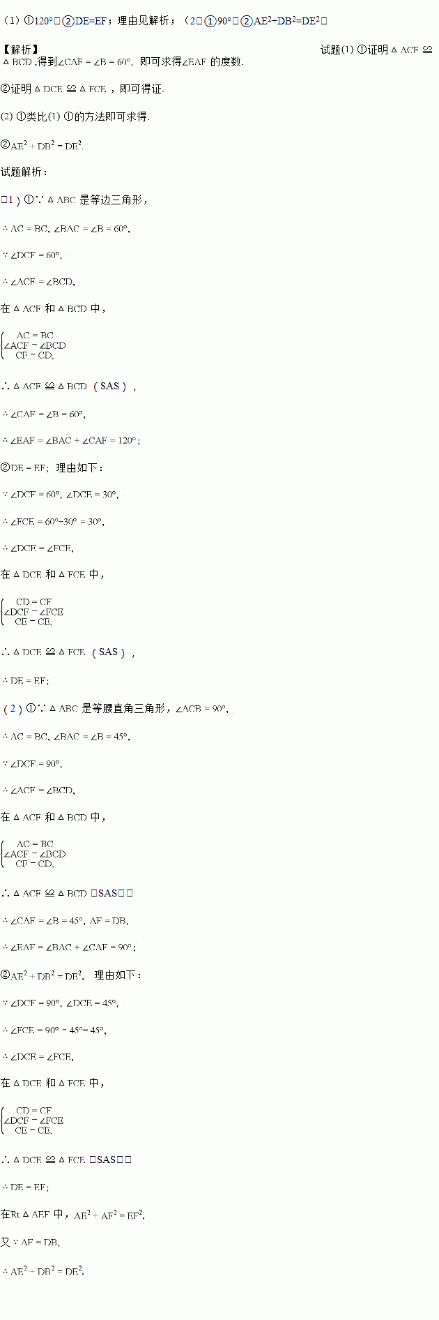(2)类比探究:如图2,△ABC为等腰直角三角形,∠ACB=90°,点D为AB边上的一点,∠DCE=45°,CF=CD,CF⊥CD,请直接写出下列结果: