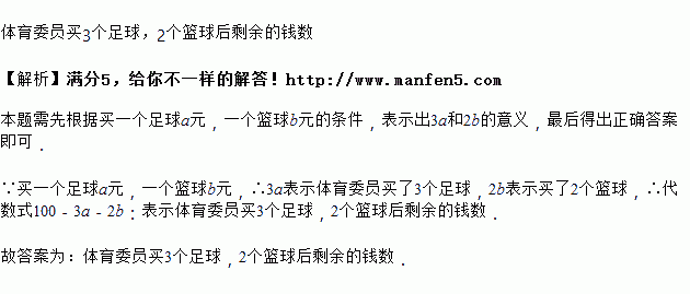 体育委员带了100元钱去买体育用品,已知一个足球a元,一个篮球b元,则代数式100-3a-2b表示的意义为_________ .