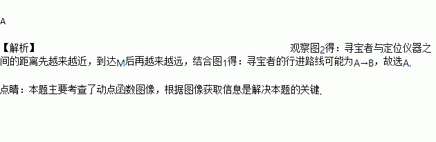 一个寻宝游戏的寻宝通道由正方形ABCD的边组成,如图1所示.为记录寻宝者的行进路线,在AB的中点M处放置了一台定位仪器,设寻宝者行进的时间为x,寻宝者与定位仪器之间的距离为y,若寻宝者匀速行进,且表示y与x的函数关系的图象大致如图2所示,则寻宝者的行进路线可能为