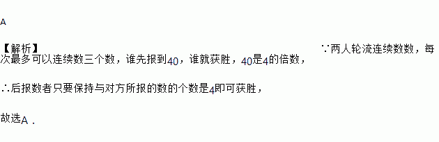 A 【解析】∵两人轮流连续数数,每次最多可以连续数三个数,谁先报到40,谁就获胜,40是4的倍数, ∴后报数者只要保持与对方所报的数的个数是4即可获胜, 故选A.