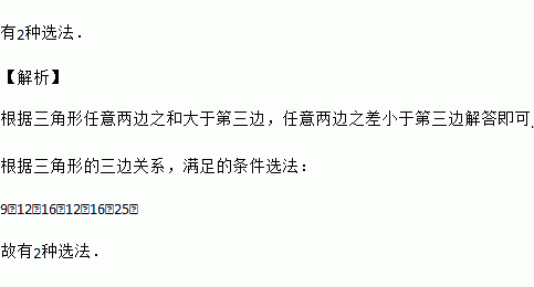 有四根长度分别为9、12、16、25的木条,从中取三根搭三角形,有几种选法?为什么?