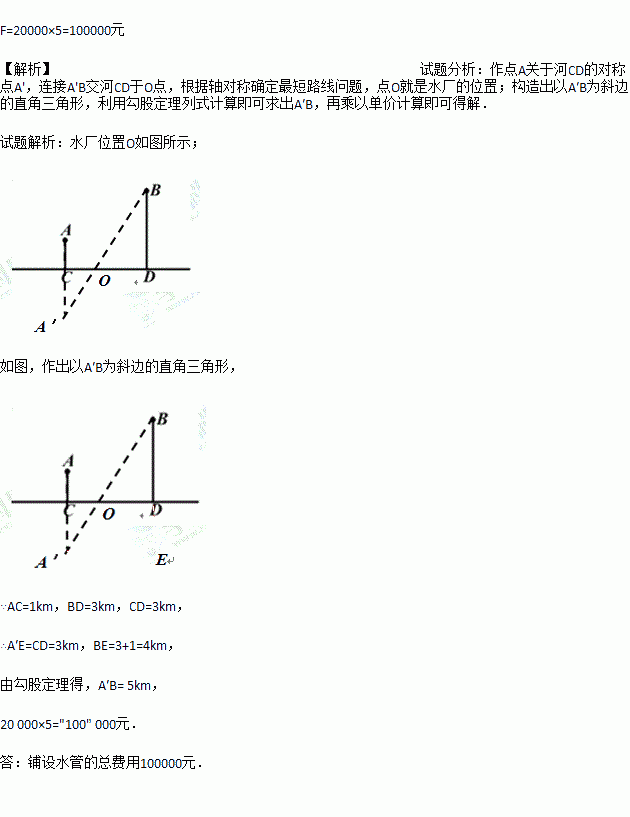 如图,A、B两个村子在河CD的同侧,A、B两村到河的距离分别为AC=1 km,BD=3 km,CD=3 km现在河边CD上建一水厂向A、B两村输送自来水,铺设水管的费用为20000元/千米,请你在河CD边上选择水厂位置O,使铺设水管的费用最省,并求出铺设水管的总费用?