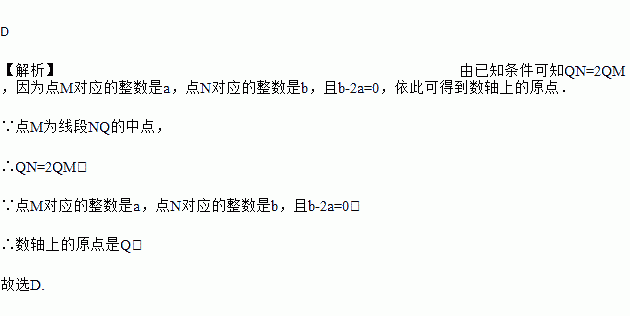 如图,数轴上M,N,P,Q四点对应的数都是整数,且M为线段NQ的中点,P为线段NM的中点.若点M对应的整数是a,点N对应的整数是b,且b-2a=0,则数轴上的原点是( )