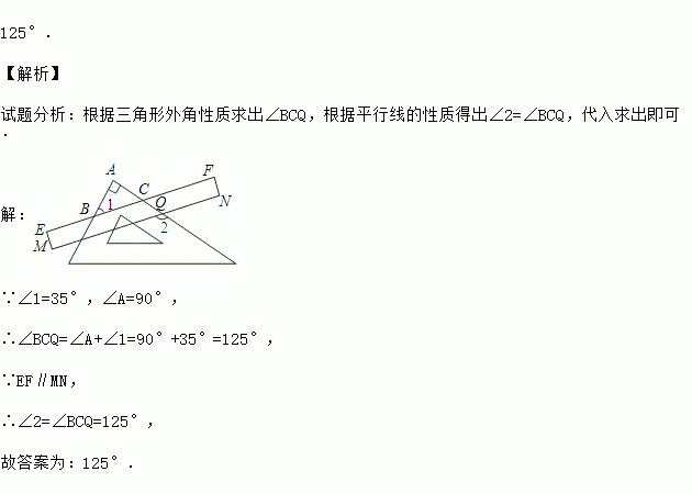 把一块直尺与一块三角板如图放置,若∠1=35°,则∠2的度数为 .