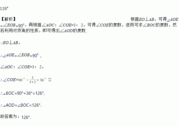 如图,直线 AB,CD 相交于点 O,EO⊥AB,垂足为 O,∠AOC:∠COE=3: 2,则∠AOD=___ .