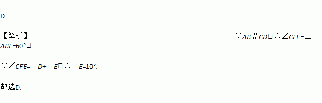 如图,AB∥CD,∠ABE=60°,∠D=50°,则∠E的度数为( )