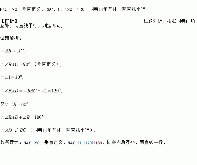 如图,已知∠1=30°,∠B=60°,AB⊥AC,将证明AD∥BC的过程填写完整.