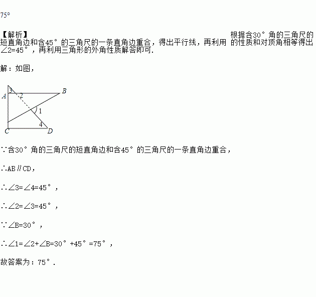 将一副三角尺按如图所示的方式放置,使含30°角的三角尺的短直角边和含45°角的三角尺的一条直角边重合,则∠1的度数是 .