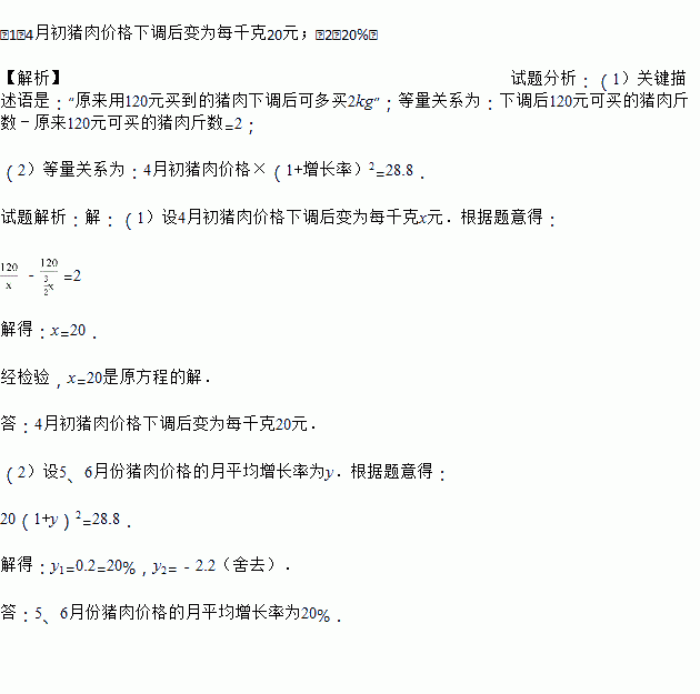 ,原来用120元买到的猪肉下调后可多买2kg.4月中旬猪肉价格开始回升,经过两个月后,猪肉价格上调为每千克28.8元.