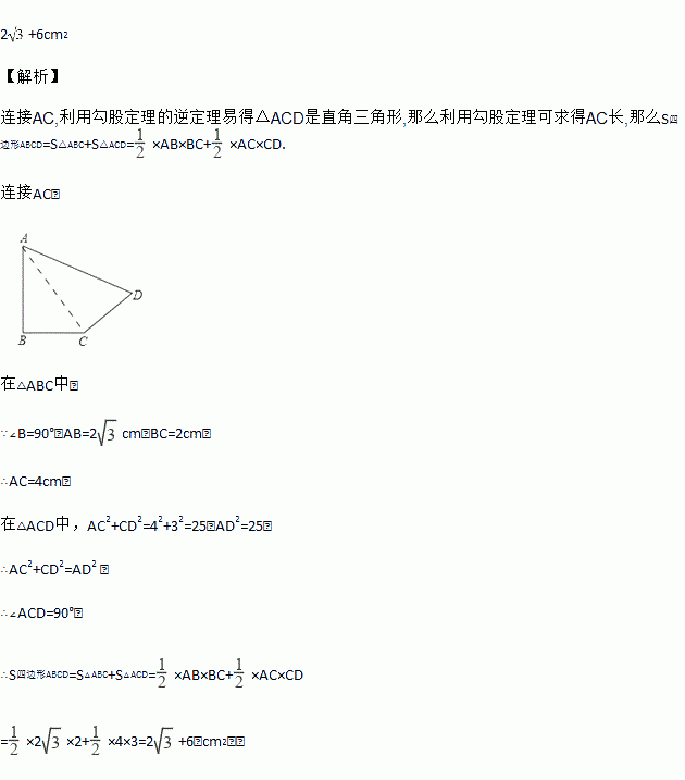 如图,已知∠B=90°,AB=2cm,BC=2cm,CD=3cm,AD=5cm,求四边形ABCD的面积.