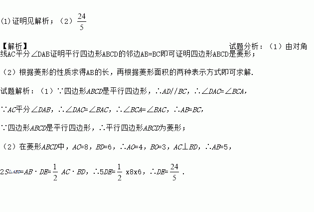 四边形ABCD是平行四边形,对角线AC平分∠DAB,AC与BD相交于点O,DE⊥AB于E点.(1)求证:四边形ABCD是菱形;