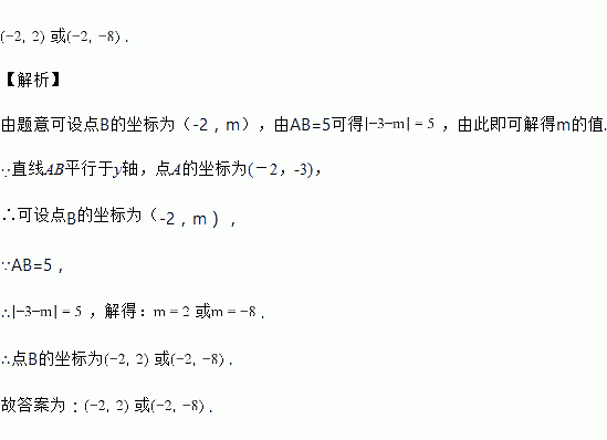 在平面直角坐标系中,直线AB平行于y轴,点A的坐标为(-2,-3),线段AB=5,则点B的坐标为____________.