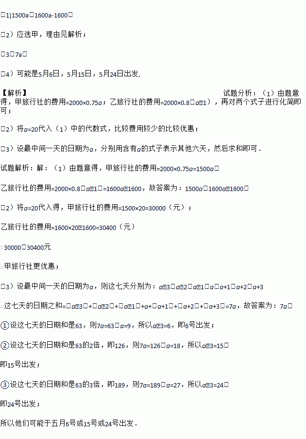 (1)1500a,1600a-1600; (2)应选甲,理由见解析; (3)7a; (4)可能是5月6日,5月15日,5月24日出发. 【解析】试题分析:(1)由题意得,甲旅行社的费用=2000×0.75a;乙旅行社的费用=2000×0.8(a﹣1),再对两个式子进行化简即可; (2)将a=20代入(1)中的代数式,比较费用较少的比较优惠; (3)设最中间一天的...