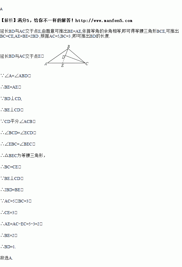 如图,D为△ABC内一点,CD平分∠ACB,BD⊥CD,∠A=∠ABD,若AC=5,BC=3,则BD的长为( )