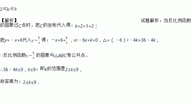 如图,过C(2,1)作AC∥x轴,BC∥y轴,点A,B都在直线y=-x+6上.若双曲线y=(x>0)与△ABC总有公共点,则k的取值范围是________.