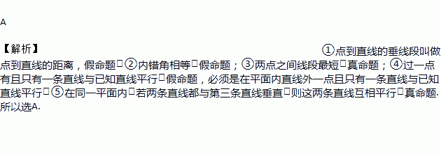A 【解析】①点到直线的垂线段叫做点到直线的距离,假命题;②内错角相等,假命题;③两点之间线段最短,真命题;④过一点有且只有一条直线与已知直线平行,假命题,必须是在平面内直线外一点且只有一条直线与已知直线平行;⑤在同一平面内,若两条直线都与第三条直线垂直,则这两条直线互相平行。真命题.所以选A.