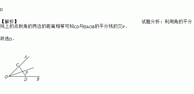 D 【解析】试题分析:利用角的平分线上的点到角的两边的距离相等可知CD与∠AOB的平分线的交P. 故选D.