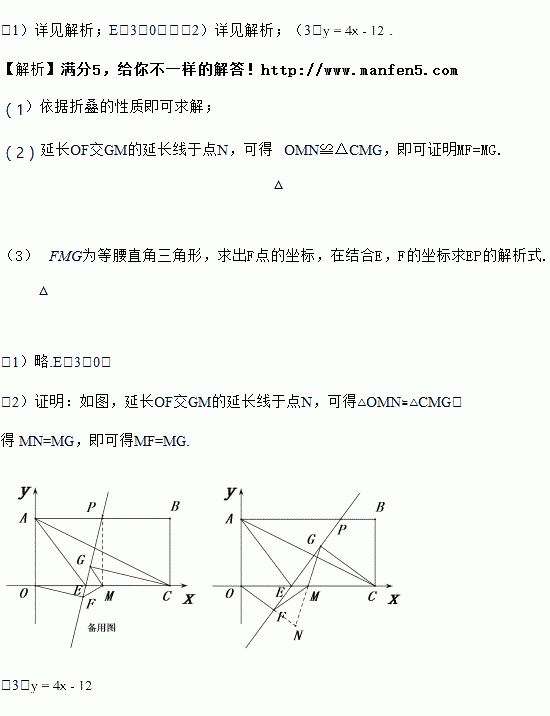 (2)点M为OC的中点,点P为线段AB上一动点,作直线EP,分别过点O、C作直线EP的垂线,垂足分别为点F、G.求证:MF=MG