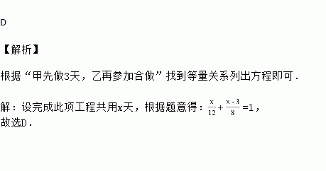 某工程,甲独做需12天完成,乙独做需8天完成,现由甲先做3天,乙再参加合做,求完成这项工程共用的时间.若设完成此项工程共用x天,则下列方程正确的是( )