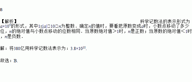 B 【解析】科学记数法的表示形式为a×10n的形式,其中1≤|a|<10,n为整数.确定n的值时,要看把原数变成a时,小数点移动了多少位,n的绝对值与小数点移动的位数相同.当原数绝对值>1时,n是正数;当原数的绝对值<1时,n是负数. 【解析】 将380亿用科学记数法表示为:3.8×1010. 故选:B.