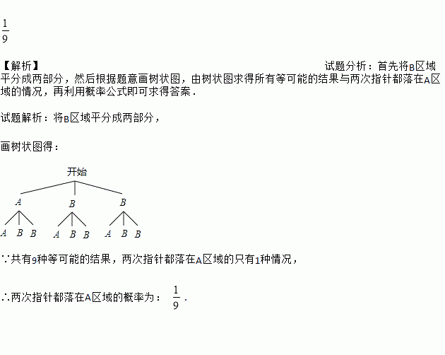 如图,有一转盘中有A、B两个区域,A区域所对的圆心角为120°,让转盘自由转动两次.利用树状图或列表求出两次指针都落在A区域的概率。