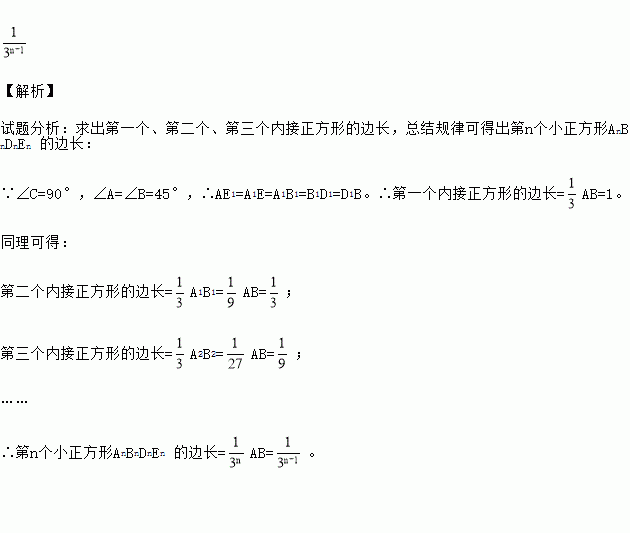 如图,△ABC是斜边AB的长为3的等腰直角三角形,在△ABC内作第1个内接正方形A1B1D1E1(D1、E1在AB上,A1、B1分别在AC、BC上),再在△A1B1C内接同样的方法作第2个内接正方形A2B2D2E2,…如此下去,操作n次,则第n个小正方形AnBnDnEn 的边长是 .