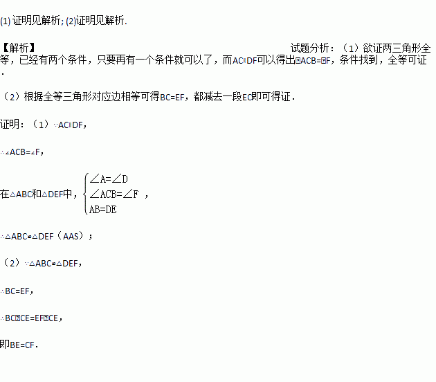 已知:点B、E、C、F在同一直线上,AB=DE,∠A=∠D,AC∥DF.