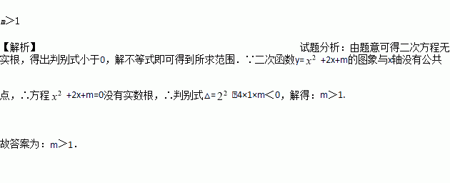 若二次函数y=x2+2x+m的图象与x轴没有公共点,则m的取值范围是________.