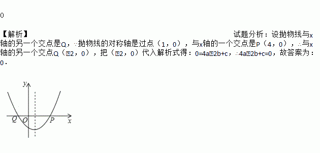 如图,抛物线y=ax2+bx+c(a>0)的对称轴是过点(1,0)且平行于y轴的直线,若点P(4,0)在该抛物线上,则4a﹣2b+c的值为________.