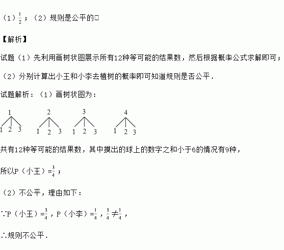 在“植树节”期间,小王、小李两人想通过摸球的方式来决定谁去参加学校植树活动,规则如下:在两个盒子内分别装入标有数字1,2,3,4的四个和标有数字1,2,3的三个完全相同的小球,分别从两个盒子中各摸出一个球,如果所摸出的球上的数字之和小于5,那么小王去,否则就是小李去.